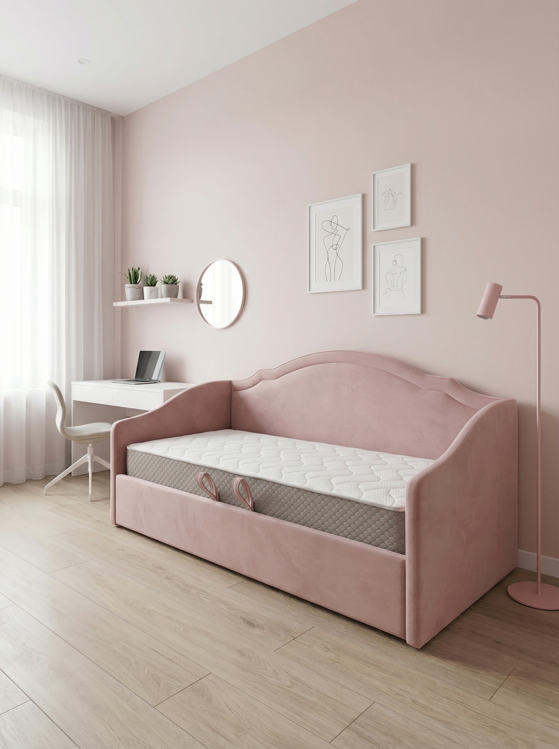 Кровать Рокси - это идеальный выбор для детской комнаты. Модель с фигурным мягким изголовьем высотой 107 см создаёт ощущение защищённости и комфорта. Обивка доступна в велюре Teddy и Nebby - это плотные, приятные на ощупь ткани, устойчивые к износу. Выбирайте из 199 оттенков, чтобы идеально вписать кровать в интерьер.